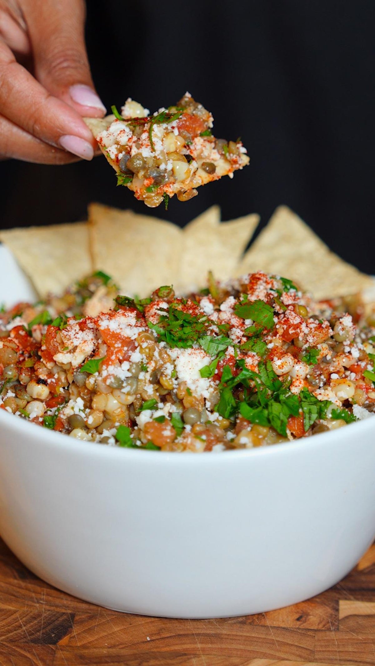 Cooking note: Cotija cheese is replaced with a firm tofu-based crumble seasoned with nutritional yeast and salt, which mimics the crumbly texture and adds protein while eliminating saturated fat. Olive oil is reduced from 2 tbsp to 1 tsp since the dip is already moist from pico de gallo and lentils — no emulsification chemistry is disrupted. Sugar is replaced with a pinch of stevia (0 calories) as it only serves flavor balance in the dressing; no Maillard or structural role is present.