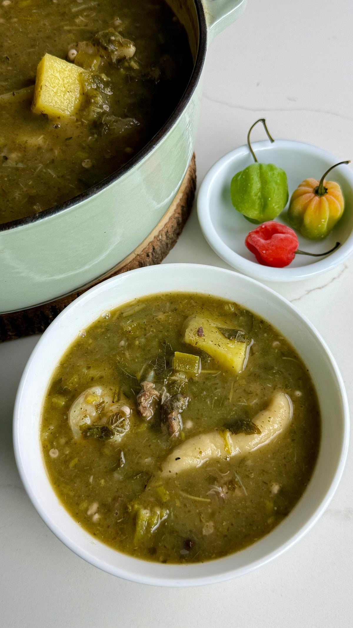 Cooking note: Removing the flour-based dumpling spinners eliminates starch thickening; the blended callaloo still provides body. Reducing coconut milk from ½ cup to 2 tablespoons cuts saturated fat while preserving flavor. Increasing shrimp and adding extra beef keeps the broth protein-dense without altering the soup's liquid balance.
